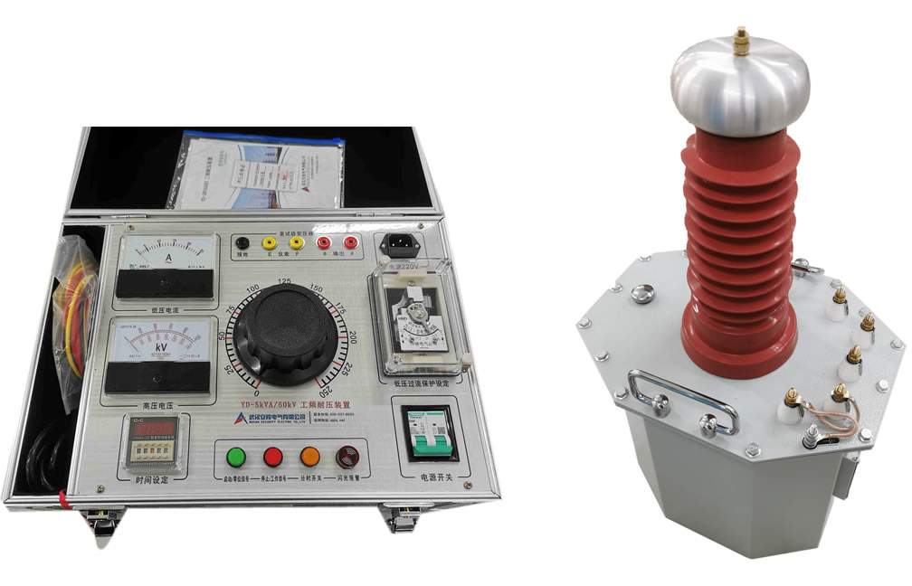 YD-5KVA/50KV工頻耐壓裝置(下稱試變)又稱升壓器,它是發(fā)電站、供配電系統(tǒng)及科研單位等廣大用戶的基本試驗設(shè)備。用于對各種電器產(chǎn)品、電氣設(shè)備、絕緣材料等進行規(guī)定電壓下的絕緣強度試驗,考核產(chǎn)品的絕緣水平,發(fā)現(xiàn)被試品的絕緣缺陷,衡量承受過電壓的能力。